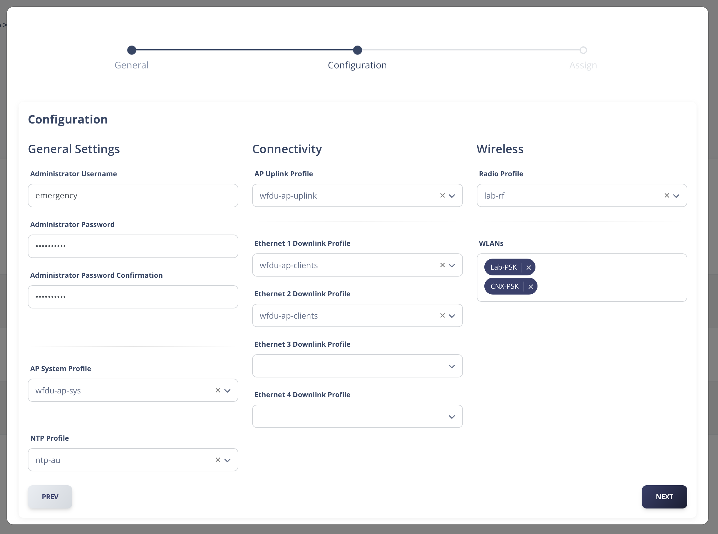 - Unassign unused profiles - Any profiles without a selection will have any existing profile assignments in Central removed. For example: if there is currently NTP profile assigned for the selected scopes in Central, the config set contains no profile selection, and the 'Unassign unused profiles' option is selected, then the NTP profile current assigned to the scopes will be unassigned.