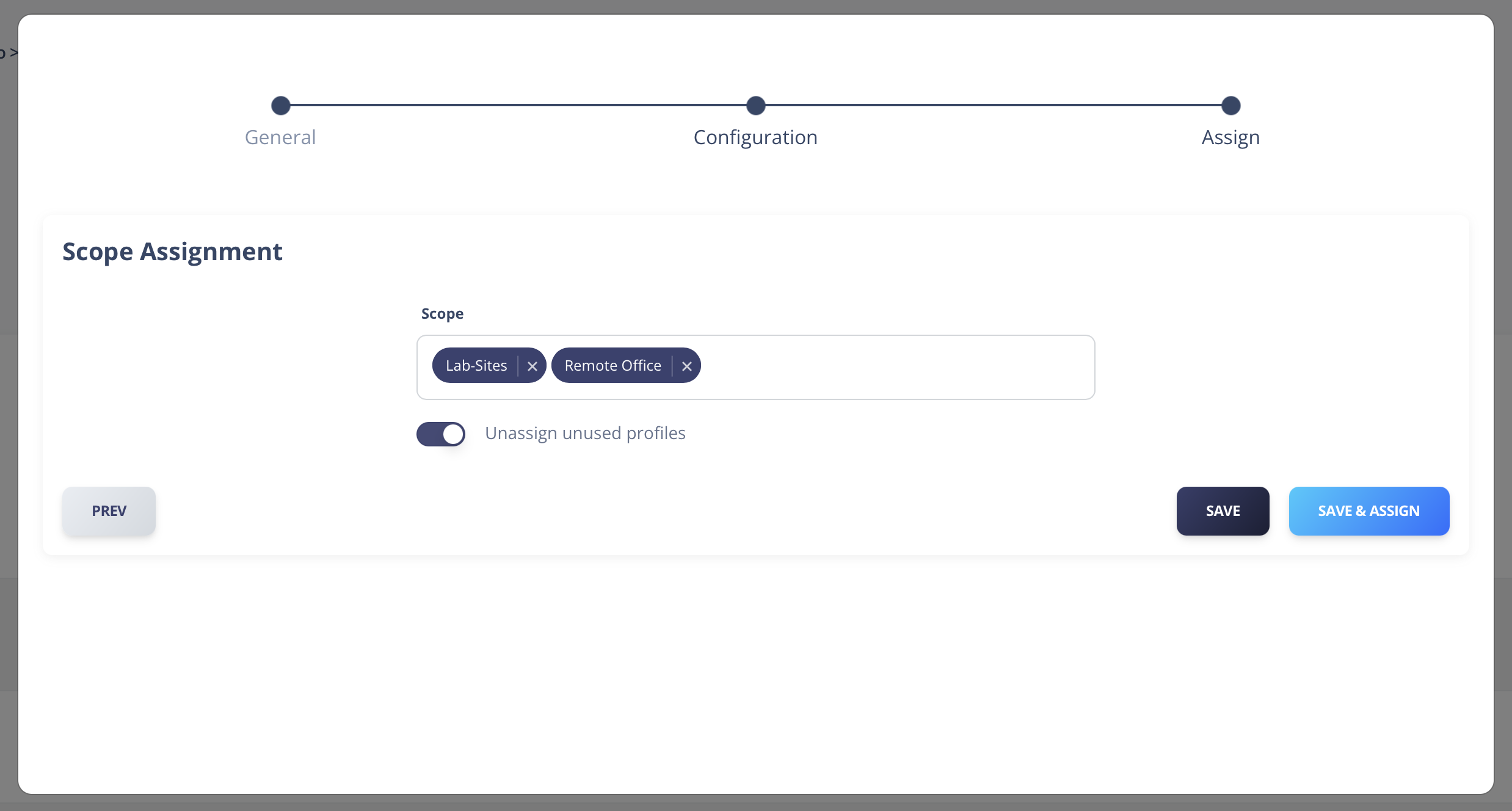 - Empty Profile Selections - By default, profiles without a selection are ignored during the scope assignment process. Existing profiles that are assigned to the selected scopes in Central will remain assigned. Currently selected profiles can be removed from the set by clicking the 'x' on the dropdown. The normal Central hierarchy for profile inheritance is followed if no profile is selected and assigned.